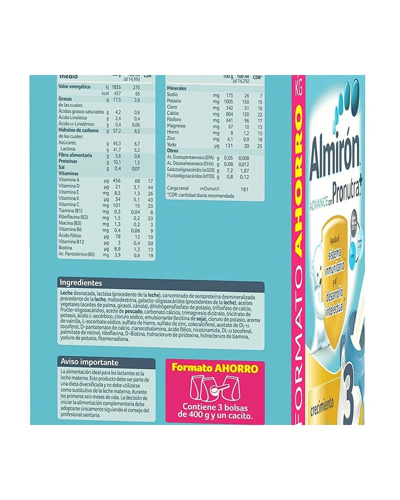 LECHE DESNATADA, LACTOSA (PROCEDENTE DE LA LECHE), CONCENTRADO DE SEROPROTEINA DESMINERALIZADA PROCEDENTE DE LA LECHE, MALTODEXTRINA, FIBRA ALIMENTARIA (GALACTO-OLIGOSACÁRIDOS PROCEDENTES DE LA LECHE Y FRUCTO-OLIGOSACÁRIDOS), ACEITES VEGETALES (ACEITES DE PALMA, GIRASOL, CÁNOLA), DIHIDRÓGENOFOSFATO DE POTASIO, TRIFOSFATO DE CALCIO, ACEITE DE PESCADO, CARBONATO CÁLCICO, TRIMAGNESIO DICITRATO, TRICITRATO DE POTASIO, ÁCIDO L-ASCÓRBICO, CLORURO SÓDICO, EMULSIONANTE (LECITINA DE SOJA), CLORURO DE POTASIO, AROMA DE VAINILLA, L-ASCORBATO SÓDICO, SULFATO DE HIERRO, SULFATO DE ZINC, COLECALCIFEROL, ACETATO DE DL-Α TOCOFEROL, D-PANTOTENATO DE CALCIO, CIANOCOBALAMINA, ÁCIDO FÓLICO, NICOTINAMIDA, DL-Α TOCOFEROL, PALMITATO DE RETINOL, RIBOFLAVINA, D-BIOTINA, HIDROCLORURO DE PIRIDOXINA, HIDROCLORURO DE TIAMINA, YODURO DE POTASIO, FITOMENADIONA.